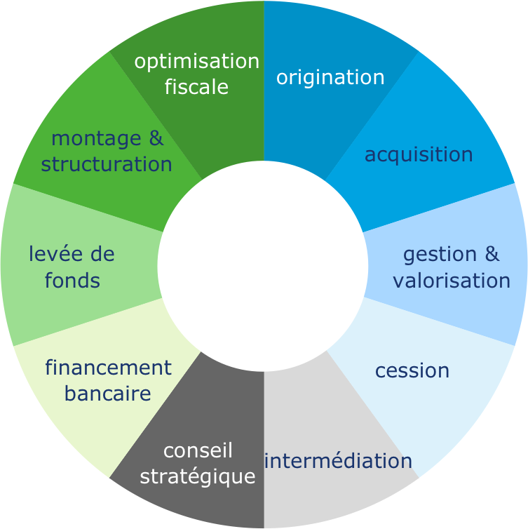 Caryatid AM propose des services de conseil stratégique et/ou d’ingénierie financière portant sur des problématiques complexes de structuration, de développement, de portage ou d’analyse de performance(s) opérationnelle(s). La société conçoit et mène à bien les stratégies permettant de créer de la valeur pour ses clients, de lever les fonds pour atteindre leurs objectifs de croissance ou de trouver de nouveaux axes de développement. L’approche de la société, méthodique et innovante, est uniquement guidée par l’intérêt de chaque client et reste indépendante de la mise en œuvre de toute transaction.